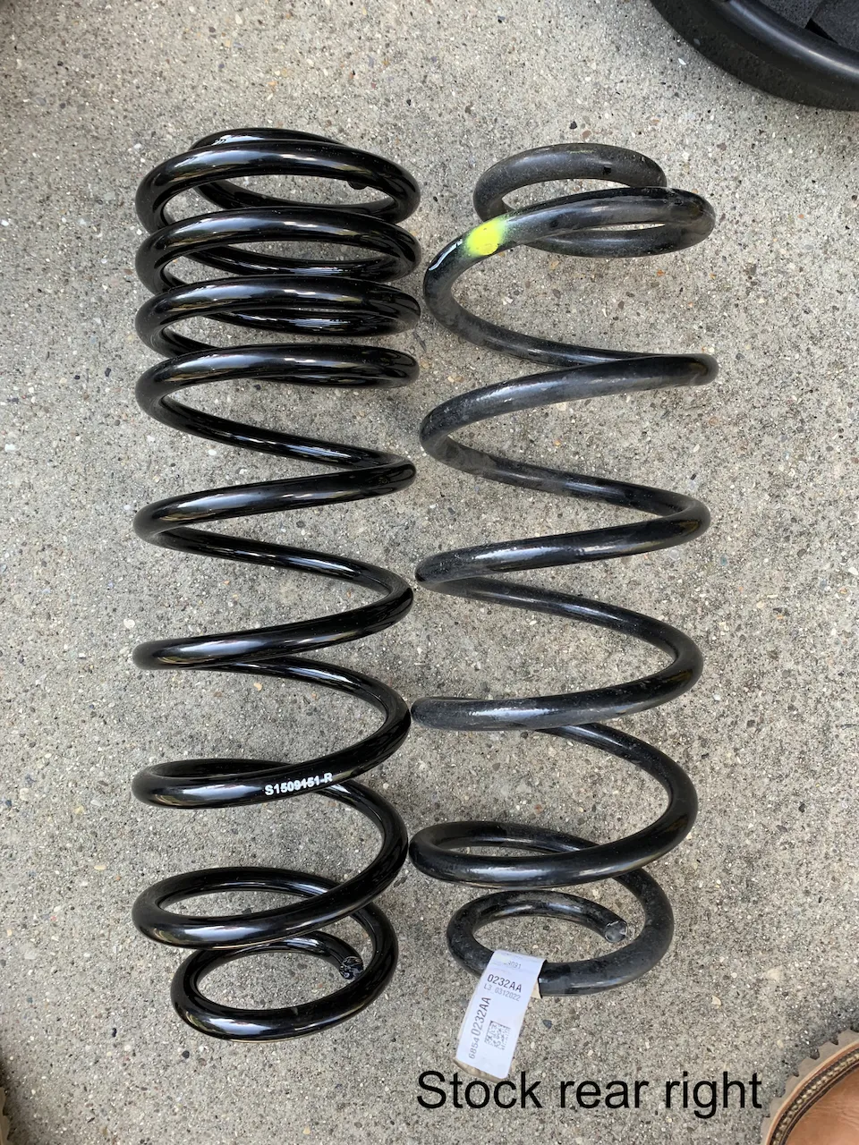 Their rear coils are dual rate spring (137/200 lbs/in) and the right spring is taller than the left one to offset the gas tank weight. They marked with L and R so pay attention and don't use the right side spring on the rear left otherwise you'll have a lean to the right side. Due to this dual spring rate, I also noticed the rear sags 1/4" when my two little kids sit in the back. Because it compress the the top par of the spring at 137 lbs/in. Another community member also commented "the rear sag was slightly greater than stock". I think it'll take a lot weight to fully sag the second part of the spring at 200 lbs/in, and their 1.5" springs are still stronger than the factory ones.